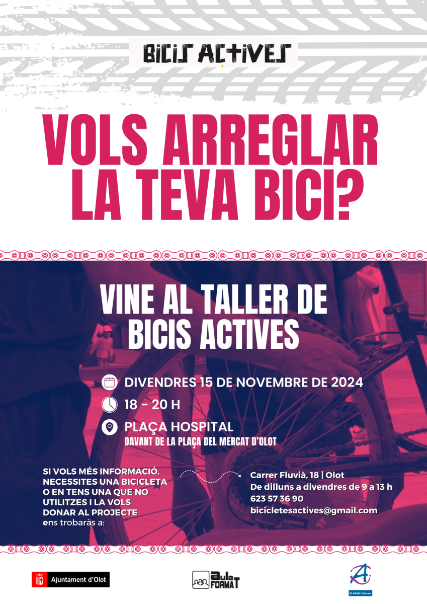 Bicis Actives per mitjà d’Aula Format ha previst un nou taller de manteniment i reparació de bicicletes aquest divendres 15 de novembre de 2024 de 18 a 20 h a la Plaça del Mercat d'Olot.
