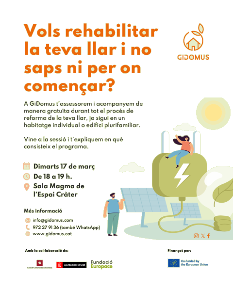 De la mateixa manera, el programa GiDomus ha organitzat una sessió informativa adreçada a la ciutadania que tindrà lloc el dimarts 17 de març a les 18:00h a l’Espai Cràter d’Olot. L’activitat és gratuïta i oberta a tothom.