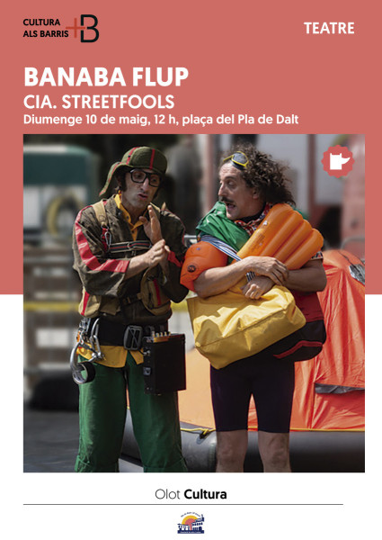 El diumenge 10 de maig, a les 12 h, la plaça del Pla de Dalt acollirà Banaba Flup, de la companyia StreetFools. L’espectacle presenta dos personatges que, davant l’amenaça d’un gran diluvi provocat pel canvi climàtic, es preparen per sobreviure en una embarcació. A través de l’humor i el llenguatge gestual, la proposta reflexiona sobre les pors, les dificultats i la importància de l’amistat en situacions adverses.
