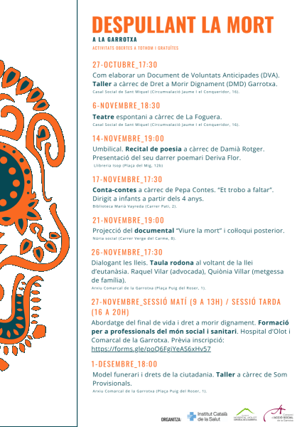 El cicle Despullant la mort està organitzat per l’Institut Català de la Salut, l’Hospital d’Olot i Comarcal de la Garrotxa i el Consorci d’Acció Social de la Garrotxa, amb la col·laboració de diversos equipaments i entitats culturals i socials de la Garrotxa, com la Biblioteca Marià Vayreda, la Llibreria Isop, el Núria Social i altres espais compromesos amb la reflexió i la cultura de les cures.