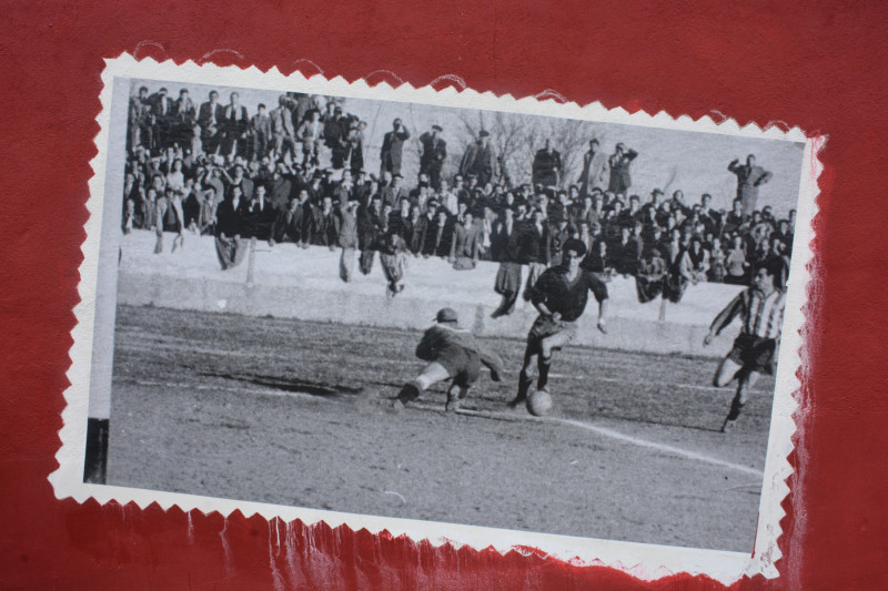 A la darrera foto del mural es veu una jugada del jove Lluís Llorens. La temporada 1954-55, mentre el primer equip patia a Segona Regional i perdia contra el Sant Esteve d’en Bas, els juvenils liderats pel noi de Can Surroca brillaven. Van ser campions provincials i van fer un gran paper als campionats de Catalunya i d’Espanya. El joc de Llorens, que jugava d’interior esquerre, meravellava l’afició. Les cròniques destacaven la força del seu xut. Va ser ell qui, l’any 1955, va marcar el primer gol en la inauguració de l’Estadi Municipal.