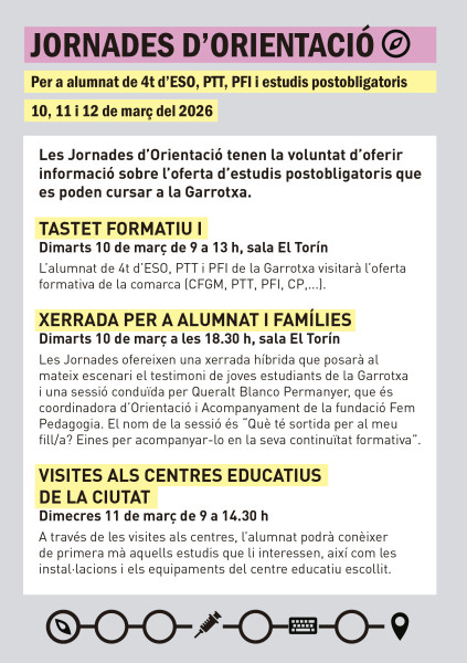 L’Ajuntament d’Olot, a través d’Olot Educació, Dinamig i amb la col·laboració de centres educatius, empreses i entitats del territori, organitza una nova edició de les Jornades d’Orientació, que tindran lloc els dies 10, 11 i 12 de març de 2026.