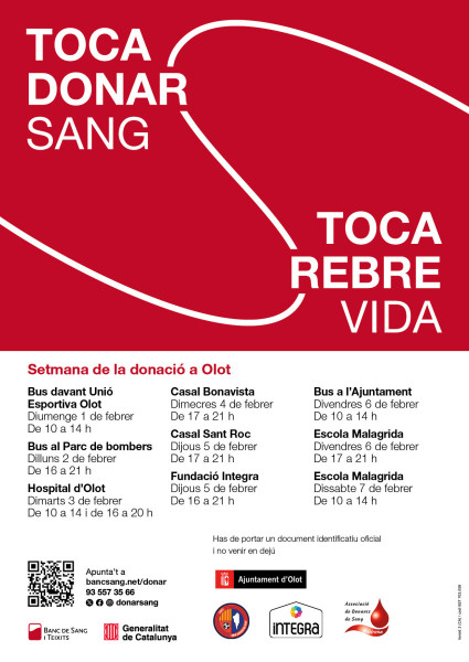 De l’1 al 7 de febrer s’ha previst la celebració d’una nova setmana de la donació a Olot. Des del Banc de Sang i Teixits alerten que les reserves de sang estan més baixes del que sol ser habitual en aquesta època i que està costant recuperar la davallada registrada durant les festes de Nadal.