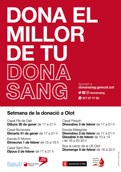 Aquest dilluns, 30 de gener de 2023 comença una nova campanya de donació de sang a Olot. Fins al diumenge 5 de febrer, les persones interessades podran donar sang en algun dels 7 punts habilitats: el Casal Pla de Dalt, el Casal Bonavista, l’Escola El Morrot, el Casal Sant Roc, el Casal Pequín, l’Escola Malagrida i el bus del camp de la UE Olot.