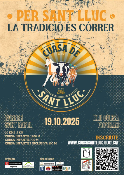 L’Àrea d’Esports de l’Ajuntament d’Olot impulsa una nova edició d’aquesta prova esportiva que se celebrarà el proper diumenge 19 d’octubre. La Cursa de Sant Lluc sortirà del carrer Sant Rafel i compta amb cinc modalitats: un recorregut de 10 km, un altre de 5 km i tres curses infantils (de 1.400 m, 700 m i una cursa inclusiva de 100m).