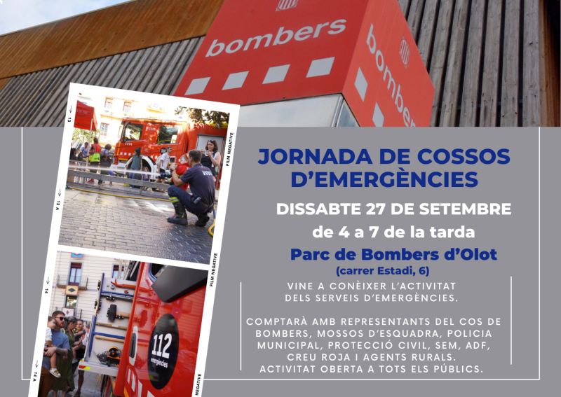 Aquest mateix dissabte 27 de setembre, el Parc de Bombers d’Olot serà l’epicentre d’una jornada de cossos d’emergència. A partir de les 16 h de la tarda, les persones que vulguin conèixer la feina dels Bombers tindran l’ocasió d’apropar-se fins a les instal·lacions del carrer Estadi.