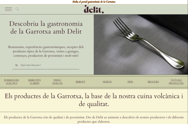 Delit és una plataforma en línia que reuneix l’oferta gastronòmica de la Garrotxa amb l’objectiu de visibilitzar-la i promoure-la entre locals i visitants; recollint tots els productors i comerços agroalimentaris a més de tots els restaurants i bars de la comarca, tot creant vincles entre ells i relacionant els projectes de tal manera que de cada producte l’usuari pot saber qui el produeix, on es pot comprar, on es pot degustar i quines opcions d’oci i descoberta té per gaudir-lo.