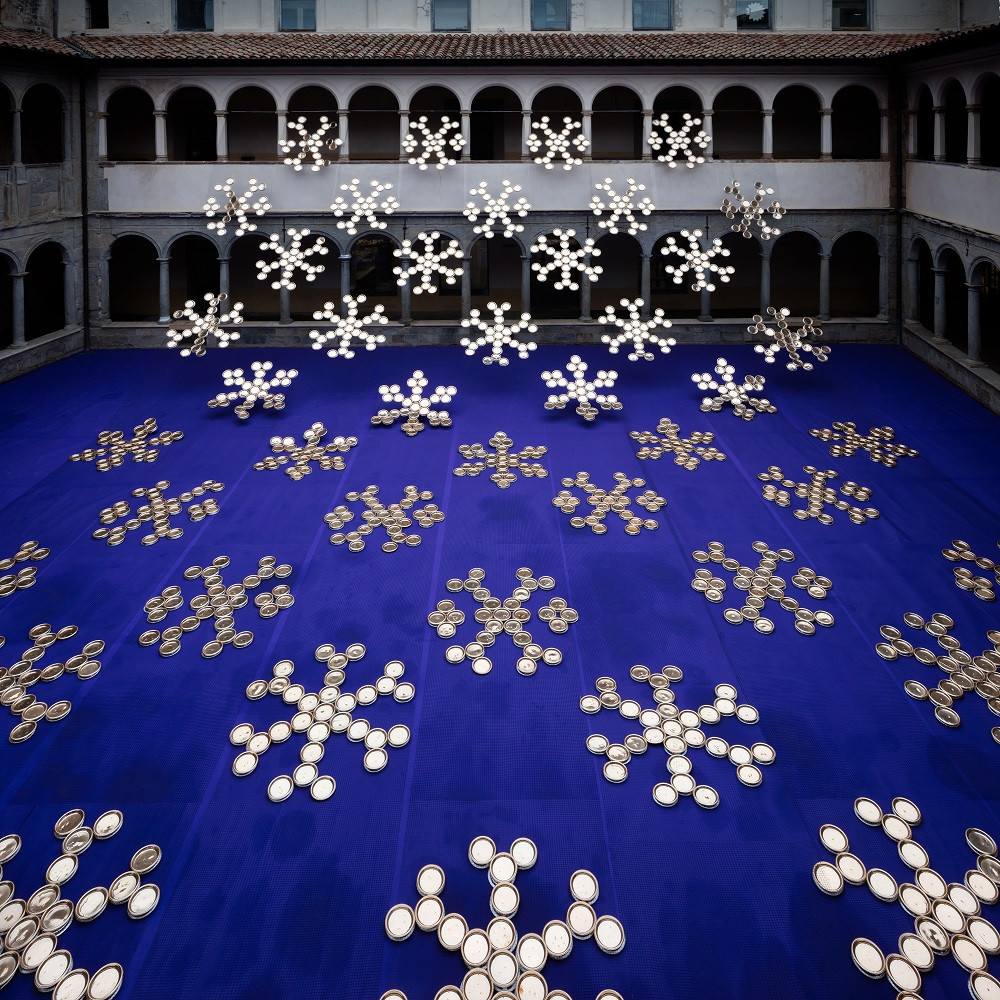 El projecte realitzat al Claustre del Carme va voler ocupar l’espai amb una intervenció tridimensional il·lusòria amb una gran trama de patrons geomètrics basats en les formes regulars dels flocs de neu.