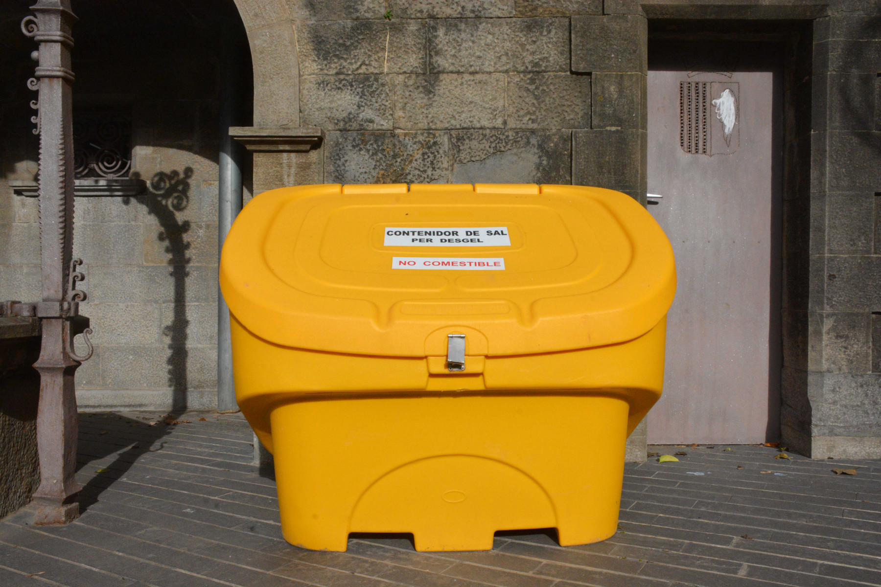 Els contenidors de sal són de plàstic de color groc i cada un d’ells té 500 quilos de capacitat. Consten d’una obertura a la part superior que permet un fàcil accés per recollir la sal del seu interior. Al llarg de l’any, l’Ajuntament d’Olot reparteix, de mitjana, 10.000 quilos de sal de desgel.