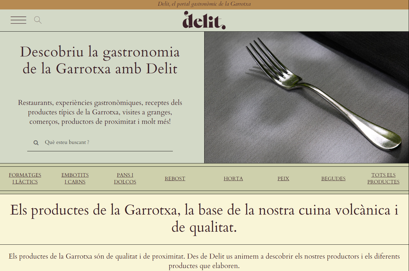 Delit és una plataforma en línia que reuneix l’oferta gastronòmica de la Garrotxa amb l’objectiu de visibilitzar-la i promoure-la entre locals i visitants; recollint tots els productors i comerços agroalimentaris a més de tots els restaurants i bars de la comarca, tot creant vincles entre ells i relacionant els projectes de tal manera que de cada producte l’usuari pot saber qui el produeix, on es pot comprar, on es pot degustar i quines opcions d’oci i descoberta té per gaudir-lo.