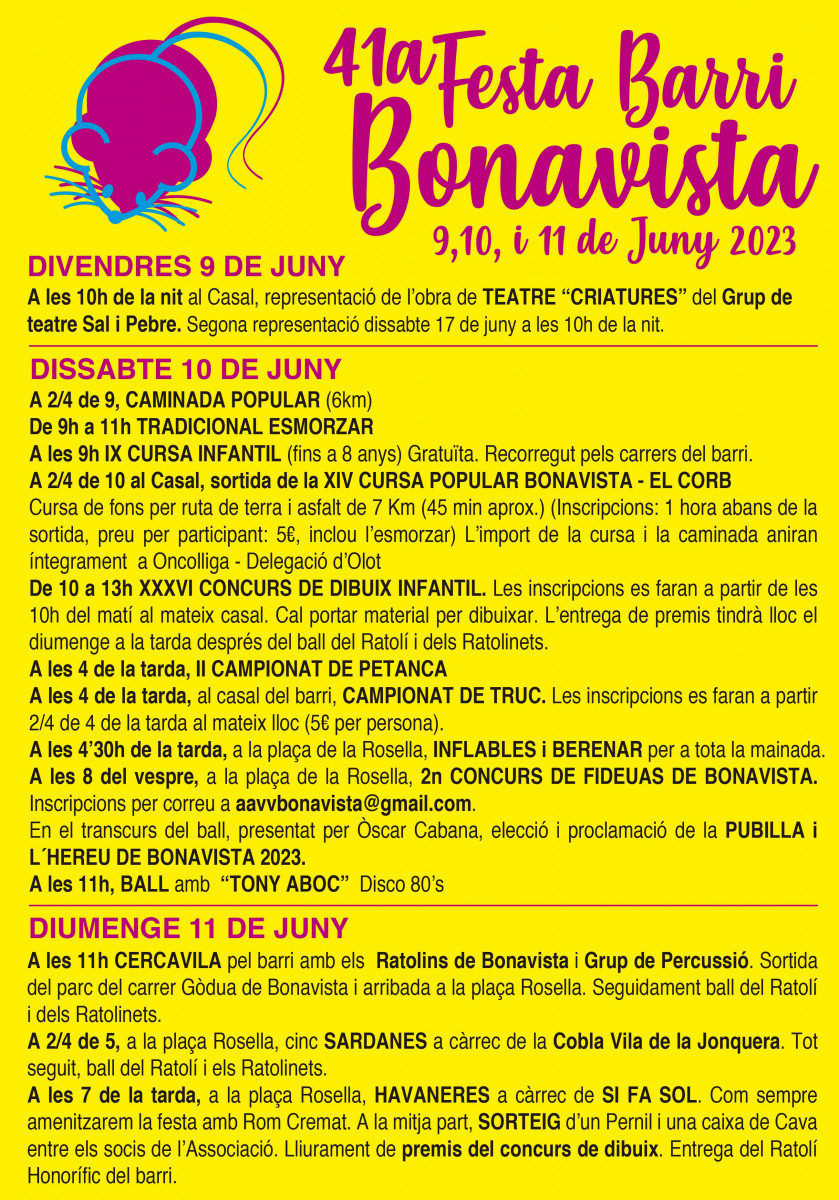 El Barri de Bonavista d'Olot celebra la seva festa major amb teatre, caminades populars, el tradicional esmorzar, cursa infantil, concurs de dibuix infantil, campionat de petanca, campionat de truc, inflables, berenar, concurs de fideuàs, l'elecció de la Pubilla i l'Hereu de Bonavista 2023 així com ball, cercavila, sardanes i havaneres.
